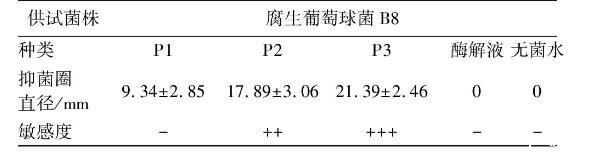 注:抑菌圈直徑<10 mm:低敏感或無效,用-代表;10 mm≤抑菌圈直徑<15 mm:中敏感,用+代表;15 mm≤抑菌圈直徑<20 mm:高敏感,用++代表;抑菌圈直徑≥20 mm:極敏感,用+++代表。