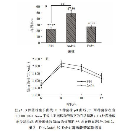 對(duì)F44和DeltardrA進(jìn)行Nisin耐受性試驗(yàn),結(jié)果如圖2C所示,DeltardrA菌株的最大有效稀釋量為1:10^6,F44對(duì)照菌株的最大有效稀釋量?jī)H為1:10^4,敲除rdrA基因使F44菌株Nisin耐受能力增強(qiáng)。