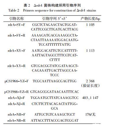 分別使用rdrA-SY-F/R、rdrA-XY-F/R引物擴(kuò)增F44基因組rdrA基因上下游各1000bp左右同源臂,以pCS1966質(zhì)粒為載體,使用BamHI和HindIII酶切位點(diǎn)連接至載體上。用同源重組雙交換原理敲除靶標(biāo)基因,通過含有5-氟乳清酸的合成培養(yǎng)基篩選得到rdrA缺失型菌株,使用rdrA-NB-F/R、rdrA-XJ-F/R引物進(jìn)行菌落PCR并進(jìn)行瓊脂糖凝膠電泳驗(yàn)證。設(shè)計(jì)引物如表2所示。