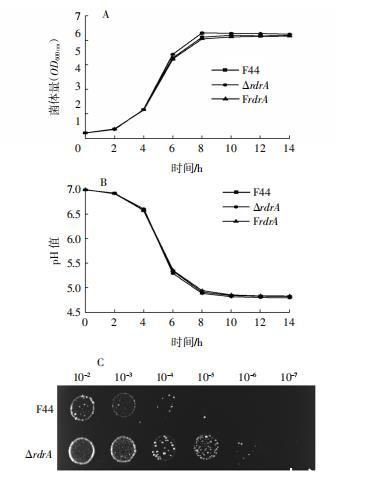 通過測(cè)定生長曲線和pH曲線發(fā)現(xiàn),F(xiàn)44、DeltardrA和FrdrA菌株生長情況無顯著區(qū)別,菌株生長遲緩期、對(duì)數(shù)期、平臺(tái)期的時(shí)間、菌體量和菌液pH值基本保持一致(圖2A、圖2B)。