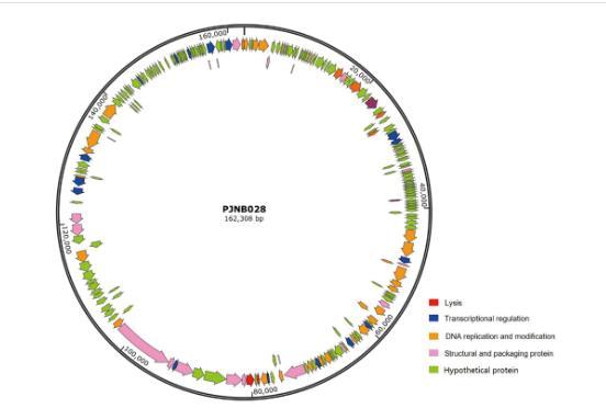 噬菌體PJNB028基因組為雙鏈環(huán)狀DNA,全長162 308 bp,G+C含量為34%。全基因組BLASTN比對結(jié)果表明,噬菌體PJNB028與枯草芽孢桿菌噬菌體Bacillus phage 2S-4相似度最高為100%。經(jīng)CARD網(wǎng)站預(yù)測PJNB028基因組中未發(fā)現(xiàn)耐藥基因、毒力基因。全基因組序列已提交至國家微生物科學(xué)數(shù)據(jù)中心(National Microbiology Data Center,NMDC),編號NMDC60203838。