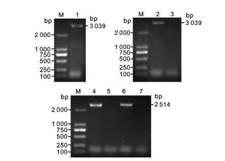 注:M:DL2000 marker;1:vgrG PCR擴增序列;2:pBAD33-vgrG載體鑒定;3:陰性對照;4:WT株;5:ΔvgrG株;6:CΔvgrG株;7:陰性對照