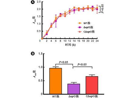 為觀察vgrG是否對體外生長產生影響,每2 h用酶標儀測定不同菌株在LB培養(yǎng)基中的A 600值,測至細菌生長平臺期。結果顯示無論在對數期(4~8 h)還是最終的平臺期(12 h以后),WT株和ΔvgrG株生長速度沒有顯著區(qū)別[(1.40±0.10)vs(1.20±0.30),t=0.63,P>0.05],ΔvgrG株和CΔvgrG株之間也沒有顯著區(qū)別(P>0.05)。以上結果表明vgrG不參與細菌的體外生長(圖3A)。