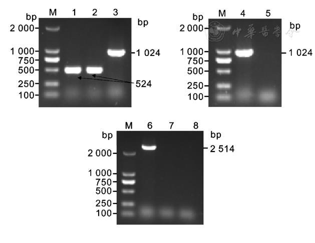 注:M:DL2000 marker;1:上游同源臂;2:下游同源臂;3:上下游同源臂;4:pKO3-Km-vgrG載體鑒定;5:陰性對照;6:WT株;7:ΔvgrG株;8:陰性對照