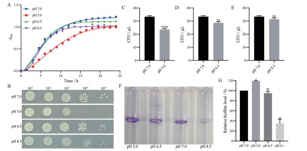 圖2 不同pH值下VNP20009的生長(zhǎng)與生物膜形成情況。A:VNP20009在600 nm波長(zhǎng)下的生長(zhǎng)曲線;B:不同pH值下的菌落耐受性;C-E:不同pH值下VNP20009的存活率。n=5,均值±SEM;F:采用玻璃試管結(jié)晶紫染色法測(cè)定不同pH值下VNP20009的生物膜形成;G:使用ImageJ軟件定量生物膜含量。n=3,均值±SEM。*與pH 7.0組相比P < 0.05,P < 0.01,**P < 0.0001。ns:無(wú)顯著差異