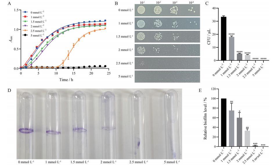 圖3 不同過(guò)氧化氫濃度下VNP20009的生長(zhǎng)與生物膜形成情況。A:VNP20009在600 nm波長(zhǎng)下的生長(zhǎng)曲線;B:不同過(guò)氧化氫濃度下的菌落耐受性;C:不同過(guò)氧化氫濃度下VNP20009的存活率。n=5,均值±SEM;D:采用玻璃試管結(jié)晶紫染色法測(cè)定不同過(guò)氧化氫濃度下VNP20009的生物膜形成;E:使用ImageJ軟件定量生物膜含量。n=3,均值±SEM。與0 mmol·L-1組相比P < 0.05,P < 0.01,P < 0.001,P < 0.0001