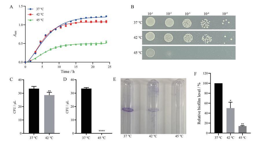 圖1 不同溫度下VNP20009的生長(zhǎng)與生物膜形成情況。A:VNP20009在600 nm波長(zhǎng)下的生長(zhǎng)曲線;B:不同溫度下的菌落耐受性;C:42℃條件下VNP20009的存活率;D:45℃條件下VNP20009的存活率。n=5,均值±平均標(biāo)準(zhǔn)誤(SEM)。菌落形成單位(CFU)是微生物學(xué)中用于估算樣品中存活細(xì)菌或真菌數(shù)量的單位;E:采用玻璃試管結(jié)晶紫(CV)染色法測(cè)定不同溫度下VNP20009的生物膜形成;F:使用ImageJ軟件定量生物膜含量。n=3,均值±SEM。*與37℃組相比P < 0.05,P < 0.01,**P < 0.0001。