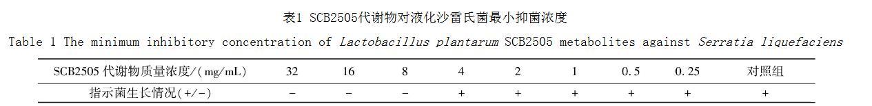 由表1可知,對于液化沙雷氏菌SCB2649菌株,植物乳桿菌SCB2505代謝物質(zhì)量濃度為4 mg/mL時(shí),液體培養(yǎng)基渾濁,指示菌液化沙雷氏菌SCB2649菌株有明顯的生長現(xiàn)象發(fā)生,但質(zhì)量濃度為8 mg/mL的試管中液體清澈,指示菌SCB2649菌株無明顯的生長現(xiàn)象,因此植物乳桿菌SCB2505代謝物對該指示菌的MIC可確定為8 mg/mL。