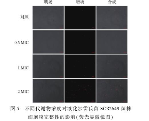 圖5不同代謝物濃度對液化沙雷氏菌SCB2649菌株細胞膜完整性的影響(熒光顯微鏡圖)