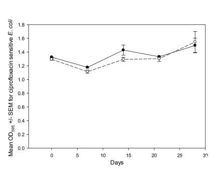 圖:從生物固體堆肥中檢測可溶性環(huán)丙沙星。將環(huán)丙沙星敏感的大腸桿菌(K-12菌株)在添加了19 ppm環(huán)丙沙星的堆肥(CIP,實線)和未添加的堆肥(CTL,虛線)的水提取液中進行培養(yǎng)。通過測量OD595來評估培養(yǎng)物密度,圖中顯示的是三個獨立重復(fù)樣品在生長24小時后的平均值。)