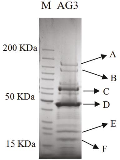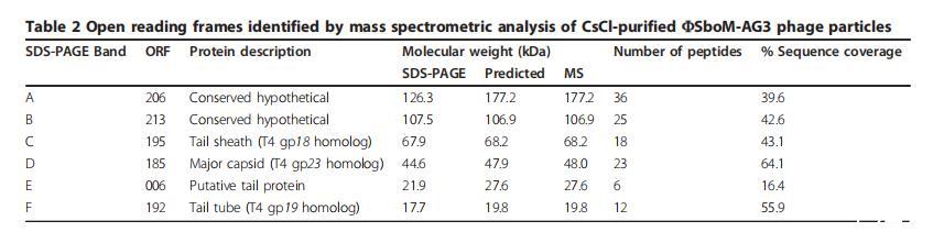 氯化銫純化的 SboM-AG3 病毒粒子通過(guò)一維 SDS-PAGE 分析,顯示出 15 個(gè)蛋白條帶(圖 4),分子量分別為 12.7、15.6、17.7、21.9、27.2、32.4、34.3、35.7、37.3、44.6、60.4、67.9、76.5、107.5 和 126.3 kDa,基于與大小標(biāo)記的比較。六個(gè)最強(qiáng)烈的條帶(命名為 A 到 F)被切下并通過(guò) QqTOF 質(zhì)譜進(jìn)行分析。蛋白條帶 B 到 F 的觀察質(zhì)量明顯與 SDS-PAGE 預(yù)測(cè)的大小相似(表 2)。