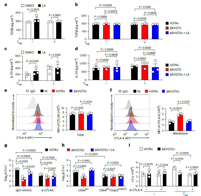 圖3、Rv1272c和亞油酸增強(qiáng)了Treg細(xì)胞上的CTLA-4表面運(yùn)輸。a-d,在感染H37Rv(a,c)或指示的Mtb菌株(b,d)1 d后,將BMDM與或不與亞油酸處理的CD4+T reg細(xì)胞共孵育1天;ELISA法檢測(cè)培養(yǎng)上清液中TGFβ(a,b)和IL-10(c,d)水平。e,f,在感染指定Mtb菌株1 d后,將BMDMs與CD4+Treg細(xì)胞共孵育1 d,用FCM測(cè)量CD4+T reg細(xì)胞中總CTLA-4水平(e)和膜CTLA-4水平(f)的MFI。g,在感染后4、8、12、16、20和24天用同種型對(duì)照IgG或抗CTLA-4抗體(每只小鼠500μg)處理的C57BL/6小鼠被氣溶膠感染,每只小鼠約200 c.f.u.指示的Mtb菌株;然后,通過(guò)飲用水對(duì)受感染的小鼠進(jìn)行亞油酸或不亞油酸治療。h)在感染后,8,12,16,20和24天用他莫昔芬治療的Ctla4fl/+或Ctla4fl/+Foxp3CreERT2小鼠被氣溶膠感染,每只指定Mtb菌株的小鼠約200c.f.u.,持續(xù)4周。使用c.f.u.測(cè)定法測(cè)量小鼠肺部的細(xì)菌負(fù)荷。i)在感染指定Mtb菌株1天后,將BMDM與或不與用同種型對(duì)照IgG或抗CLTA-4抗體(40μg ml?1)處理的CD4+T reg細(xì)胞共孵育1天。