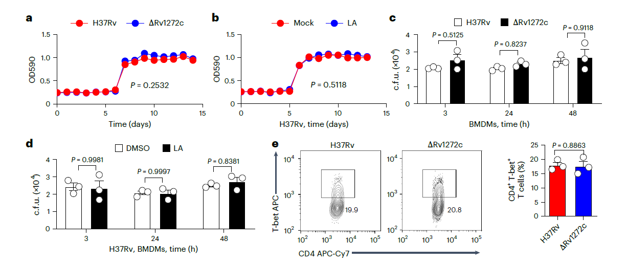 圖2、Rv1272c和亞油酸通過(guò)Treg細(xì)胞促進(jìn)分枝桿菌存活。a,b)指示的Mtb菌株(a)或H37Rv±亞油酸(b)在14天(37°C)內(nèi)的體外生長(zhǎng)曲線。c,感染H37Rv或ΔRv1272c菌株的BMDM中的細(xì)胞內(nèi)c.f.u.。d,用H37Rv感染BMDM并用亞油酸或DMSO處理。細(xì)胞內(nèi)c.f.u.在指定時(shí)間內(nèi)測(cè)定。例如,C57BL/6小鼠被指定的Mtb菌株(~200 c.f.u.)氣溶膠感染4周。使用流式細(xì)胞術(shù)(FCM)測(cè)量CD4+T-bet+(e)、CD8+T-bet+