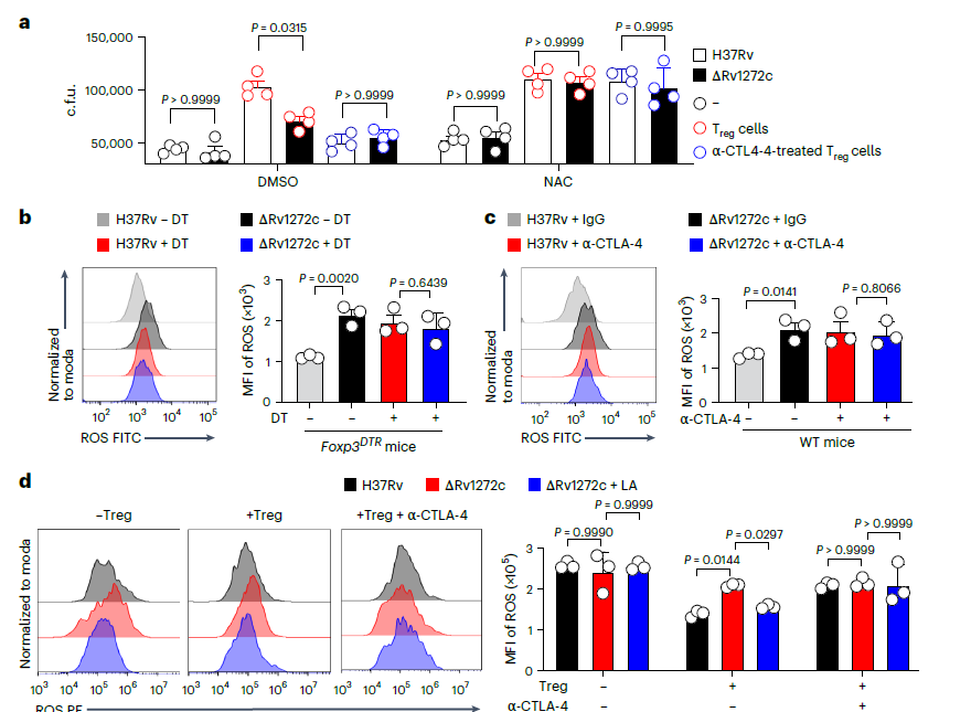 圖4、Rv1272c通過(guò)CTLA-4介導(dǎo)的ROS抑制來(lái)?yè)p害巨噬細(xì)胞的抗分枝桿菌能力。a)用DMSO或NAC(ROS抑制劑)預(yù)處理24 h,然后與同種型對(duì)照IgG或抗CTLA-4阻斷抗體(40μg ml?1)處理的Treg細(xì)胞共培養(yǎng)1 d;使用c.f.u.測(cè)定法測(cè)定指定Mtb菌株在感染2天的BMDM中的細(xì)胞內(nèi)存活率。b)在感染后4、8、12、16、20和24天用DT或PBS處理的C57BL/6或Foxp3DTR小鼠被氣溶膠感染,每只小鼠約200 c.f.u.指示的Mtb菌株,持續(xù)4周。采用FCM法測(cè)定肺組織分選的F4/80+巨噬細(xì)胞中ROS水平的MFI。c)用同種型對(duì)照IgG或抗CTLA-4抗體(每只小鼠500μg)處理的C57BL/6小鼠被氣溶膠感染,每只小鼠約200 c.f.u.指示的Mtb菌株,持續(xù)4周。采用FCM法測(cè)定肺組織分選的F4/80+巨噬細(xì)胞中ROS水平的MFI。d、在指定Mtb菌株感染1 d后,將BMDM與或不使用亞油酸處理的CD4+Treg細(xì)胞共孵育,或用同種型對(duì)照IgG或抗CLTA-4抗體(40μg ml?1)共孵育1 d;采用FCM檢測(cè)BMDMs中ROS水平的MFI。