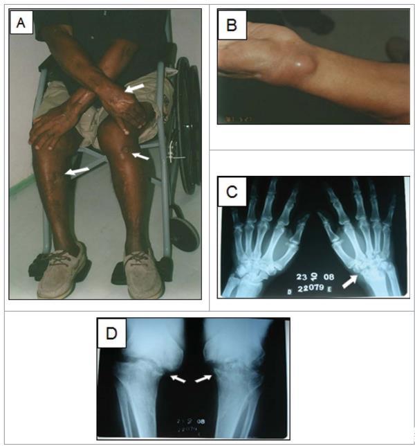 一名61歲的退休砌磚工,患有糖尿病和高血壓,因6年皮膚病變病史被轉(zhuǎn)診至里約熱內(nèi)盧Evandro Chagas國家傳染病研究所傳染病皮膚病學(xué)實驗室。初步診斷后,他接受了5個月的碘化鉀治療,皮膚病變愈合。然而,他主訴膝蓋和左腕關(guān)節(jié)疼痛逐漸加重,至轉(zhuǎn)診至INI前兩年需坐輪椅。轉(zhuǎn)診至INI前6個月,他注意到皮膚病變復(fù)發(fā)。