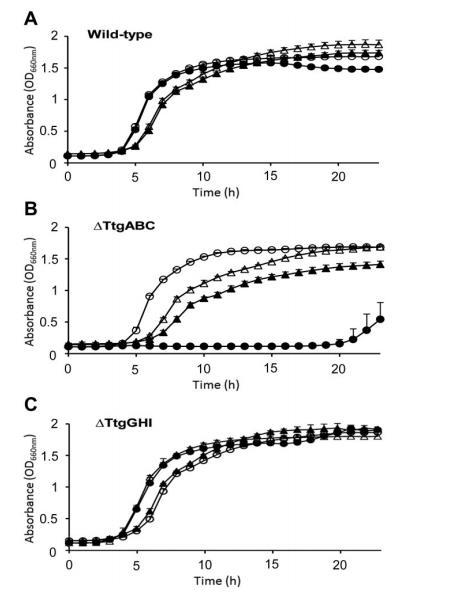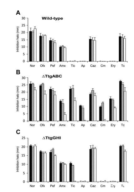 已有研究利用熒光染料HPF監(jiān)測抑菌化合物誘導(dǎo)的體內(nèi)熒光淬滅,我們進行了類似實驗:在添加50%MIC濃度藥物3小時后監(jiān)測HPF熒光,該濃度和時間可保證野生型和突變體菌株100%存活。結(jié)果顯示,氯霉素(圖1B)、紅霉素和四環(huán)素等抑菌化合物不會引起惡臭假單胞菌及其突變體的HPF熒光淬滅,這與大腸桿菌的實驗結(jié)果一致;野生型DOT-T1E在氨芐西林(圖1C)和諾氟沙星作用下出現(xiàn)HPF熒光淬滅。我們還檢測了T1E-18、T1E-PS28和雙突變體T1E-PS32的HPF熒光淬滅響應(yīng):100μg/mL氨芐西林即可誘導(dǎo)DOT-T1E-18的淬滅反應(yīng)(圖1I),該濃度是野生型菌株發(fā)生淬滅所需最低濃度的1/3;雙突變體T1E-PS32在更低濃度(1/15)下即可誘導(dǎo)HPF熒光淬滅(圖1L)。這些結(jié)果表明,盡管基于HPF淬滅模式和親本菌株及突變體T1E-PS32的耐藥性特征,TtgGHI外排泵在氨芐西林排出中的作用較弱(圖1),但仍需將氨芐西林排出功能歸因于TtgGHI——因為ttgABC/ttgGHI雙突變體在遠低于T1E-18的氨芐西林濃度下即發(fā)生HPF熒光淬滅,且對多種抗生素的敏感性更高。