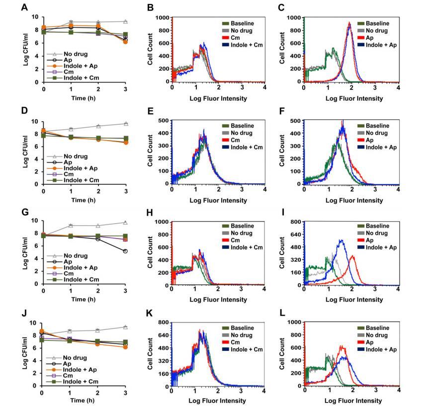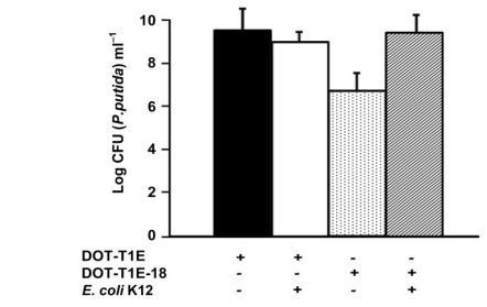 隨后,我們檢測了惡臭假單胞菌野生型、DOT1E-18與產(chǎn)吲哚大腸桿菌菌株在有無抗生素存在時的體內(nèi)生長情況:將大腸桿菌與各惡臭假單胞菌菌株以相同細胞密度(10^5 CFU/mL)接種到不含抗生素或含氨芐西林的LB培養(yǎng)基中,以各菌株單獨接種作為對照;通過在LB+氨芐西林+鏈霉素(大腸桿菌選擇性培養(yǎng)基)上涂布計數(shù)大腸桿菌細胞數(shù)量,在LB+利福平上計數(shù)DOT-T1E,在LB+利福平+卡那霉素上計數(shù)T1E-18。結(jié)果顯示,8小時后共培養(yǎng)物達到穩(wěn)定期;在對照培養(yǎng)物和各共培養(yǎng)物中,大腸桿菌細胞密度均約為10^8 CFU/mL,DOT-T1E或T1E-18的細胞數(shù)量與之相近,表明無抗生素存在時各菌株的適應(yīng)性相當。我們在300μg/mL氨芐西林存在下重復(fù)了上述共培養(yǎng)實驗:大腸桿菌因質(zhì)粒pMRS101攜帶bla基因而對該藥物耐藥,DOT-T1E菌株主要通過TtgABC泵排出抗生素而耐藥,而T1E-18菌株的生長則受氨芐西林抑制(見圖4);結(jié)果顯示,只有當培養(yǎng)基中存在大腸桿菌LK111時,T1E-18才能在氨芐西林存在下生長(圖4),表明種間信號傳導(dǎo)具有功能活性,且惡臭假單胞菌可通過識別大腸桿菌產(chǎn)生的化學(xué)信號在含抗生素的培養(yǎng)基中增殖。