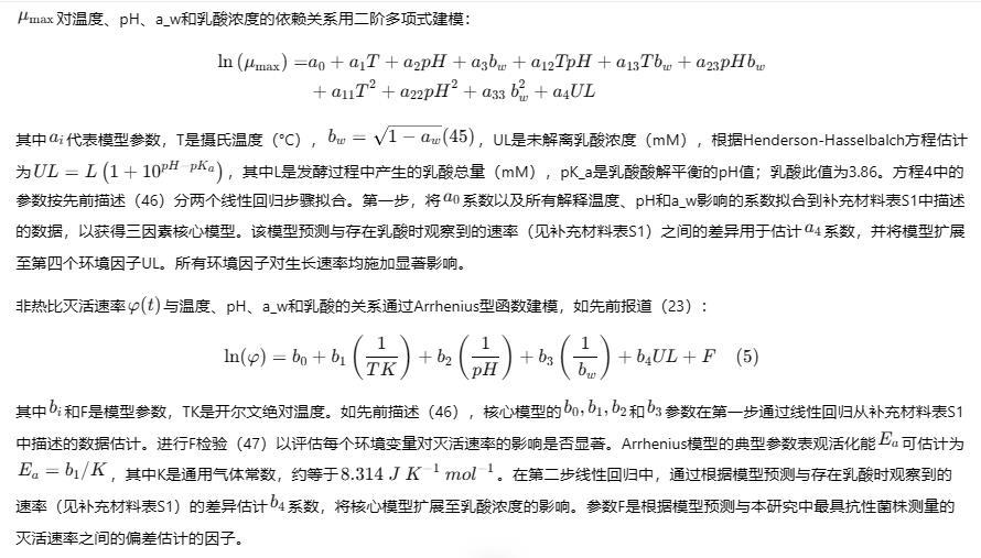 需要時(shí),通過(guò)將Baranyi和Roberts模型擬合生長(zhǎng)曲線來(lái)估計(jì)最大比生長(zhǎng)速率,而熱和非熱比滅活速率則從滅活曲線線性部分的斜率估計(jì),該曲線表示為濃度自然對(duì)數(shù)對(duì)時(shí)間的關(guān)系。