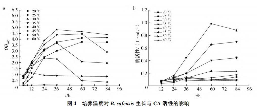 圖4培養(yǎng)溫度對B.safensis生長與CA活性的影響
