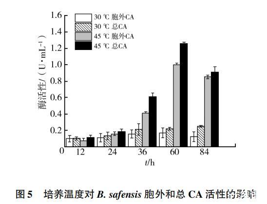 圖5培養(yǎng)溫度對B.safensis胞外和總CA活性的影響