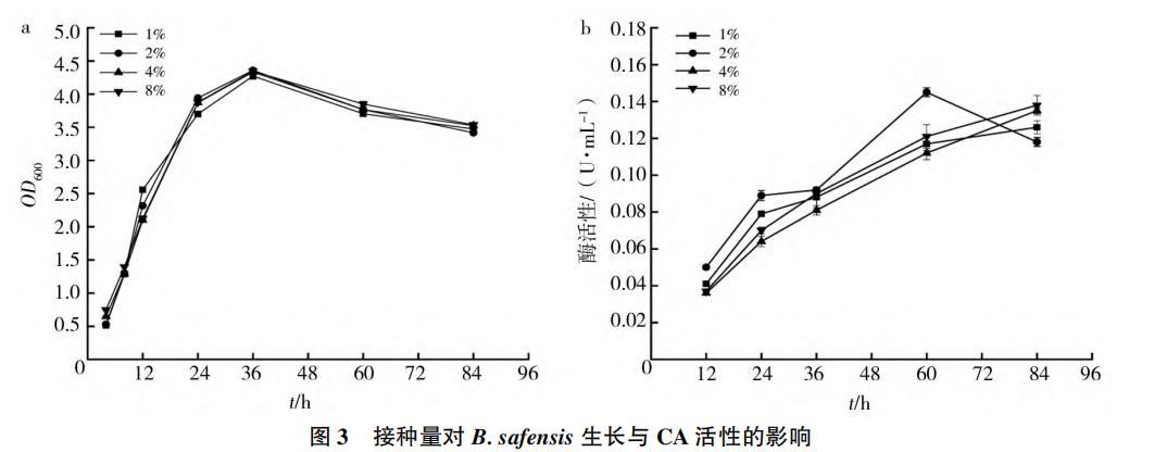 接種量對B.safensis生長及其產(chǎn)CA活性的影響如圖3所示。接種量對細(xì)菌生長的影響無顯著差異,均在36 h達(dá)到峰值,其中接種量為2%時,菌液OD???值最高,為4.36。接種量為2%時,在12~60 h培養(yǎng)期內(nèi),CA的活性逐漸升高,60 h達(dá)到峰值。結(jié)果表明,在接種量為2%條件下更有利于B.safensis生長和獲得高活性的CA。