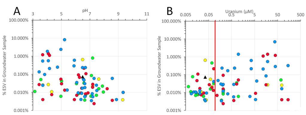 如圖4所示,所有五種ORR菌株的ESV匹配發(fā)現(xiàn)在井中跨越寬范圍pH值(從3.1到10.4)(圖4A)和鈾濃度(0.007到143μM)(圖4B)。實(shí)際上,對(duì)于所有在多個(gè)井中發(fā)現(xiàn)的四種菌株(MT049、MT058、MT094和MT123),每種都在未污染(pH~7.0,U<;0.126μM)和高度污染井(pH<4.0,U>70μM)中發(fā)現(xiàn)。