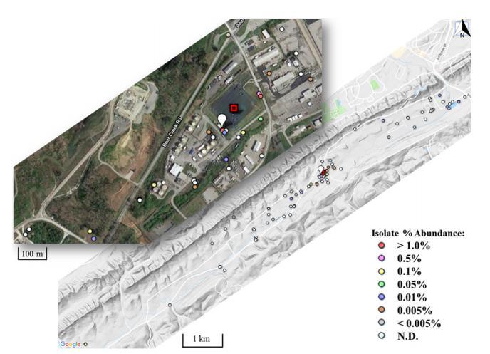 每個(gè)井位置的ESV豐度顯示用于MT123(圖5)、MT049、MT058和MT094。如圖5所示,井跨越一個(gè)11公里x 1公里區(qū)域within Bear Creek Valley包含S-3池塘。分離四種ORR菌株(有ESV數(shù)據(jù)可用)的井用白色指針標(biāo)記,S-3池塘用紅色方塊指示(圖5)。