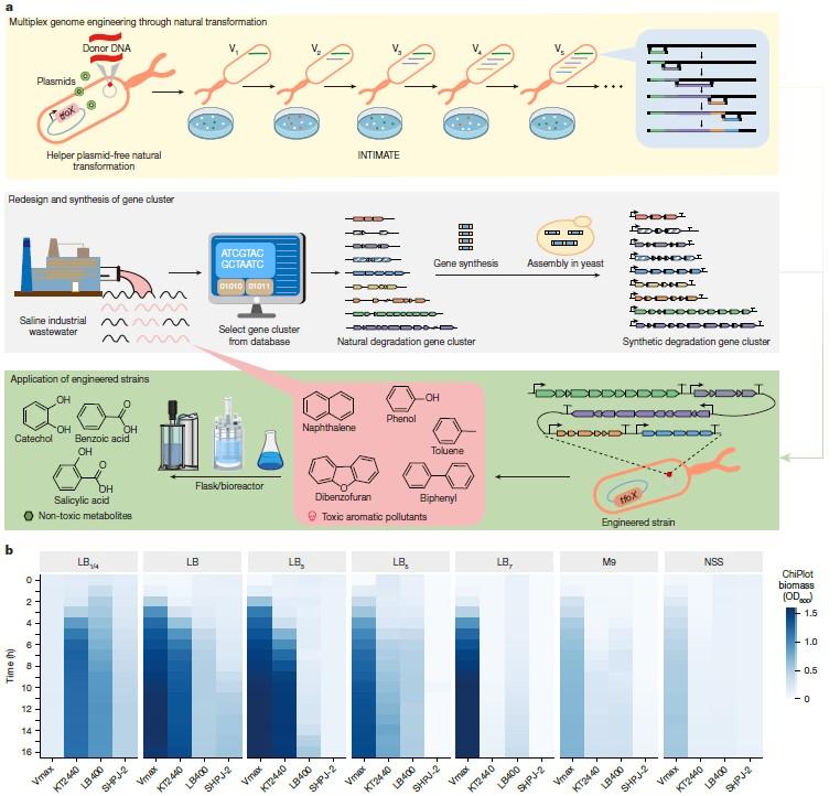 工業(yè)廢水、石油污染和塑料污染因其毒性、致突變性和持久性而成為全球海洋生物安全的重大威脅1。微生物在生物修復(fù)中的使用受到有機(jī)污染物復(fù)雜性和對(duì)鹽水脅迫的有限耐受性的限制。在這項(xiàng)研究中,研究人員使用了合成生物學(xué)將Vibrio natriegens改造成一種能夠生物修復(fù)鹽廢水和土壤中復(fù)雜有機(jī)污染物的菌株。能力主調(diào)節(jié)基因tfoX入V的1號(hào)染色體中。natriegens菌株Vmax并過(guò)表達(dá)以增強(qiáng)DNA攝取和整合。降解基因簇在酵母中化學(xué)合成和組裝。開(kāi)發(fā)了一種基因組工程方法(基于Vmax的迭代自然轉(zhuǎn)化,具有擴(kuò)增的tfoX效應(yīng))將五個(gè)基因簇(總共43 kb)轉(zhuǎn)移到Vmax中。該工程菌株能夠生物修復(fù)氯堿廠和煉油廠的工業(yè)廢水樣品中的五種有機(jī)污染物(聯(lián)苯、苯酚、萘、二苯并呋喃和甲苯),涵蓋從單環(huán)化合物到多環(huán)化合物的廣泛底物范圍。