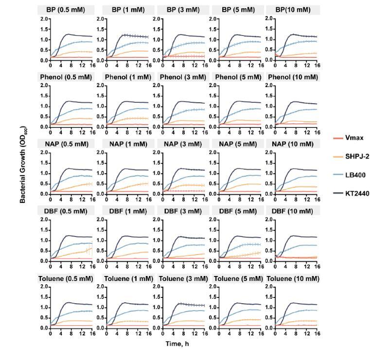 圖3、不同菌株(Vmax、SHPJ-2、LB400和KT2440)在含有聯(lián)苯(BP)、苯酚、萘(NAP)、二苯并呋喃(DBF)和甲苯的LB1/4培養(yǎng)基中生長(zhǎng)曲線。所有菌株在30℃下培養(yǎng)。芳香污染物濃度梯度設(shè)置為:0.5 mM、1 mM、3 mM、5 mM、10 mM。統(tǒng)計(jì)分析:數(shù)據(jù)用3個(gè)生物重復(fù)的平均值±SD表示。