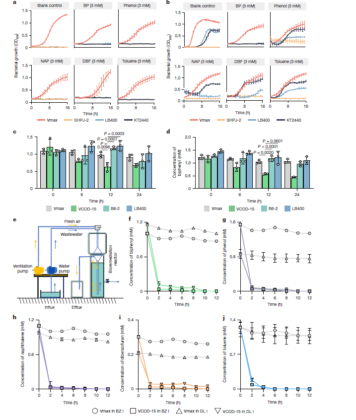圖5、VCOD-15對(duì)活性污泥生物反應(yīng)器中復(fù)雜污染工業(yè)廢水樣品的生物修復(fù)。a)鈉工業(yè)廢水樣品中的Vmax、鞘氨醇單胞菌屬SHPJ-2、B.xenovorans LB400和P.putida KT2440的生長(zhǎng)曲線,測(cè)量為OD600。菌株在廢水樣品BZ I(a)和DL I(b)中培養(yǎng),加入10 g l-1酵母提取物和相應(yīng)濃度的污染物(如面板上方的灰色條所示)在30°C下振蕩。c,d)菌株的聯(lián)苯修復(fù)效率Vmax菌株、VCOD-15菌株、P.putida B6-2菌株和工業(yè)廢水樣品BZ I(c)和DL I(d)中的B.xenovorans LB400(c)和DL I(d)e)用于修復(fù)工業(yè)廢水樣品中復(fù)雜有機(jī)污染物的活性污泥生物反應(yīng)器示意圖。f–j,復(fù)雜有機(jī)污染物。f,聯(lián)苯;g,苯酚;h,萘;i,二苯并呋喃;J,甲苯)在工業(yè)廢水樣品中VCOD-15的修復(fù)效率,在e中所示的活性污泥生物反應(yīng)器中進(jìn)行。統(tǒng)計(jì)分析:數(shù)據(jù)表示為三個(gè)生物學(xué)一式三份的平均值±s.d.(a,b)。數(shù)據(jù)表示為三個(gè)獨(dú)立實(shí)驗(yàn)(c,d)的平均值±s.d.。使用單因素方差分析(ANOVA)和Tukey多重比較檢驗(yàn)評(píng)估統(tǒng)計(jì)顯著性。數(shù)據(jù)表示為s.d.(f-j)三個(gè)生物學(xué)一式三份±平均值。
