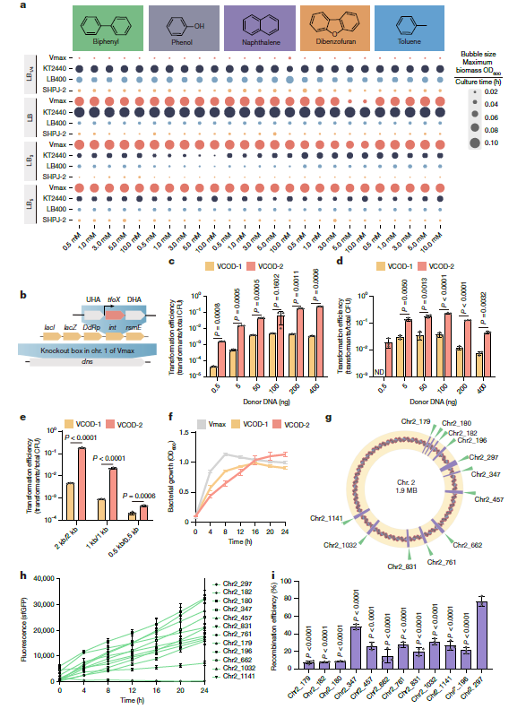 圖2、a)含有污染物(分別為聯(lián)苯、苯酚、萘、DBF和甲苯)的LB1/4、LB、LB3和LB5培養(yǎng)基中的候選菌株生長(zhǎng)速率。氣泡大小表示最大生物量(OD600)與培養(yǎng)時(shí)間(h)的比率。b)描述tfoX插入安排的示意圖。將lac縱子插入V的int位點(diǎn)。納特里根ATCC 14048生成V。納特里根Vmax的。受誘導(dǎo)型啟動(dòng)子PT7調(diào)控的tfoX基因插入chr的int位點(diǎn)。Vmax的1個(gè),DdRp的下游和rsmE的上游。c)使用0.5–400 ng p15A質(zhì)粒進(jìn)行自然轉(zhuǎn)化的VCOD-2轉(zhuǎn)化測(cè)定。d)使用染色體中0.5–400 ngΔwbfF::CmR(3 kb/3 kb)供體DNA進(jìn)行VCOD-2轉(zhuǎn)化測(cè)定,自然轉(zhuǎn)化。e)使用5 ngΔwbfF::CmR供體DNA進(jìn)行VCOD-2轉(zhuǎn)化測(cè)定,該供體DNA含有指定的自然轉(zhuǎn)化同源側(cè)翼。f)菌株Vmax、VCOD-1和VCOD-2在LB3培養(yǎng)基中的生長(zhǎng),以O(shè)D600測(cè)量。g)選擇作為CHR上候選插入位點(diǎn)的12個(gè)中性位點(diǎn)的分布。Vmax的2。h)通過(guò)自然轉(zhuǎn)化插入12個(gè)位點(diǎn)的表達(dá)sfGFP的細(xì)胞的熒光。i,使用2 kb側(cè)翼同源片段和sfgfp供體DNA表征12個(gè)位點(diǎn)的重組效率。