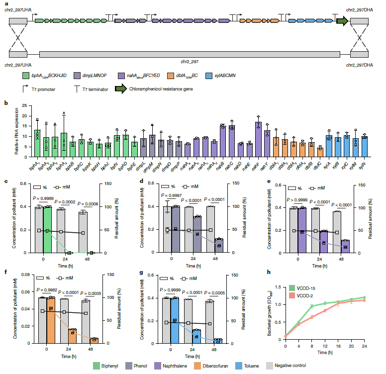 圖4、通過(guò)VCOD-15和基因表達(dá)水平檢查復(fù)雜有機(jī)污染物的修復(fù)。a,插入VCOD-15染色體的基因簇的示意圖(VmaxΔint::tfoXΔchr2_297::bphA1234BCKHJID::dmpLMNOP:nahAabcdBFCYED::dbfA1234BC::xylABCMN)。將五個(gè)基因簇(bph、dmp、no、dbf和xyl)依次插入中性位點(diǎn)chr2_297。氯霉素抗性基因CmR顯示為深綠色箭頭。連接基因簇的長(zhǎng)度為43 kb。b,對(duì)工程V中復(fù)雜污染物降解基(c,聯(lián)苯;d,苯酚;e,萘;f,DBF;g,甲苯)。彩色(VCOD-15)和灰色(Vmax)點(diǎn)反映污染物濃度(左y軸)。彩色(VCOD-15)和灰色(Vmax)條形表示污染物的殘留數(shù)量(右y軸)。h,菌株VCOD-2和VCOD-15在LB3培養(yǎng)基中的生長(zhǎng)測(cè)量為OD600。