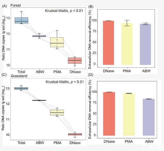 圖6.基于不同核酸提取方法的標簽胞外DNA拷貝數(shù)和去除效率(A)森林生態(tài)系統(tǒng)中不同核酸提取方法下標簽胞外DNA的拷貝數(shù);(B)森林生態(tài)系統(tǒng)中不同核酸提取方法下標簽胞外DNA的去除率;(C)草原生態(tài)系統(tǒng)中不同核試驗提取方法下標簽胞外DNA的拷貝數(shù);(D)草原生態(tài)系統(tǒng)中不同核酸提取方法下標簽胞外DNA的去除率。Total:總DNA提取;DNase:DNase預(yù)消化;ABW:堿性緩沖液洗滌;PMA:疊氮溴化丙錠(PMA)處理。