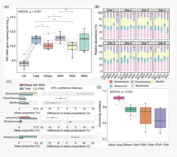 圖5.不同核酸提取方法所表征的模擬微生物類群的多度和群落結(jié)構(gòu)(A)土壤16S rRNA基因拷貝數(shù);(B)模擬土壤微生物群落的結(jié)構(gòu);(C)總微生物和活體微生物類群的相對多度差異,差異通過t檢驗揭示;(D)總DNA提取和不同土壤活體微生物研究方法所表征模擬群落結(jié)構(gòu)的相似性。Total:總DNA提??;DNase:DNase預(yù)消化;ABW:堿性緩沖液洗滌;PMA:疊氮溴化丙錠(PMA)處理;rRNA:rRNA直接表征。
