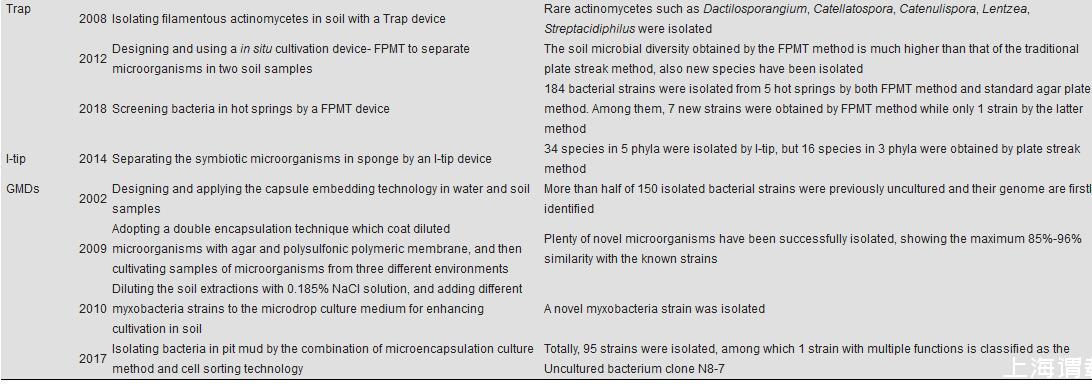 原位培養(yǎng)是將稀釋的環(huán)境樣品置于區(qū)室獨(dú)立小孔中,用半透性膜(0.03μm/0.2μm)上下封閉小孔,最終將其放回原來所棲息的自然環(huán)境或模擬生境中進(jìn)行培養(yǎng)。裝置的孔之間互不干擾,由于半透膜的選擇性,孔內(nèi)外的微生物細(xì)胞無法進(jìn)出半透膜,但自然環(huán)境中的某些信號分子或關(guān)鍵營養(yǎng)因子等小分子能穿透半透膜進(jìn)入孔中,為微生物所利用,進(jìn)而促進(jìn)孔中難培養(yǎng)微生物的生長。原位培養(yǎng)法主要包括擴(kuò)散室法、分離芯片法、Trap技術(shù)、I-tip技術(shù)和膠囊包埋技術(shù)。這些方法都是通過模擬目標(biāo)微生物的自然環(huán)境進(jìn)行分離培養(yǎng),有利于微生物與微生物或與自然環(huán)境之間建立化學(xué)交流。有關(guān)原位培養(yǎng)方法的開發(fā)與應(yīng)用如表1所示。