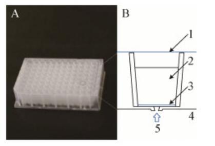 圖4 UNIFILTER過濾微孔板照片(A)和FPMT一孔示意圖(B)[66]Figure 4 Photograph of the UNIFILTER filtration microplate(A)and schematic diagram of one well of FPMT(B)[66]注:1:蓋子;2:培養(yǎng)基;3:PVDF濾膜(孔徑0.45μm);4:土壤或者底泥樣品;5:微生物Note:1:Cover;2:Medium;3:0.45μm pore size PVDF filter;4:Soil or silt sample;5:Microorganisms