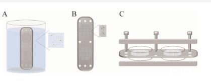 在開發(fā)應(yīng)用擴(kuò)散室法培養(yǎng)微生物的基礎(chǔ)上,Nichols等開發(fā)了一種名叫“分離芯片”(Isolation Chip,ichip)的高通量分離裝置(圖2),可用于大量分離培養(yǎng)環(huán)境中的未培養(yǎng)微生物[62]。使用時(shí),將有上百個(gè)通孔的分離板放在已稀釋的含樣品微生物細(xì)胞的培養(yǎng)基懸液中(圖2A),使每個(gè)通孔捕捉到含有適量微生物細(xì)胞的培養(yǎng)基(圖2B),最后將分離板夾在聚碳酸酯膜(孔徑為0.03μm)與上下兩層板構(gòu)成的半透性屏障中間(圖2C),將裝置置于目標(biāo)微生物所棲息的環(huán)境中進(jìn)行原位培養(yǎng)[62,74]。