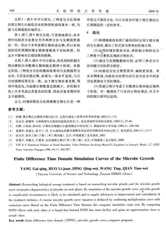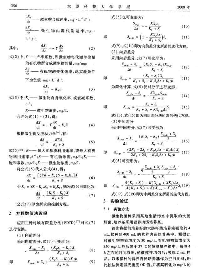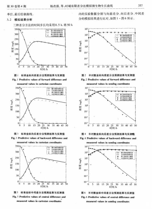 研究微生物生長是研究污水生物處理的基礎,微生物生長曲線又能體現(xiàn)出微生物在不同的生長階段的特征。利用計算機模擬微生物生長曲線的形態(tài),將有利于對各種復雜環(huán)境下微生物的生長進行預測,以便為處理工藝的改進的控制提供參考。文章將增殖曲線和消亡曲線同時應用于微生物的生長曲線,推導出形式簡單的控制方程。并運用時域有限差分法,將控制方程轉化為可用計算機實現(xiàn)的形式。將程序模擬結果與實驗結果相比對,證明時域有限差分法能夠較好地預測微生物的生長狀況。經(jīng)過幾種差分方法的比較,認為向前差分法的方程更簡單,編程更容易,預測的結果也與實際值較接近。