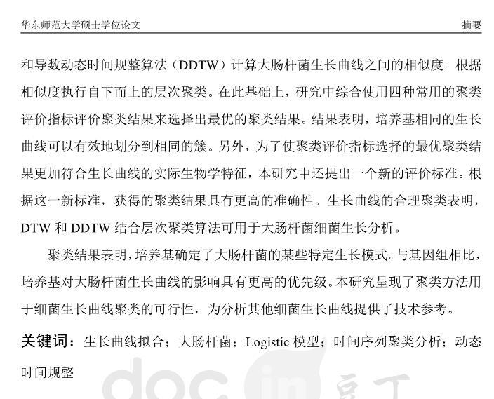 根據(jù)這一新標(biāo)準(zhǔn),獲得的聚類結(jié)果具有更高的準(zhǔn)確性。生長(zhǎng)曲線的合理聚類表明,DTW和DDTW結(jié)合層次聚類算法可用于大腸桿菌細(xì)菌生長(zhǎng)分析。聚類結(jié)果表明,培養(yǎng)基確定了大腸桿菌的某些特定生長(zhǎng)模式。與基因組相比,培養(yǎng)基對(duì)大腸桿菌生長(zhǎng)曲線的影響具有更高的優(yōu)先級(jí)。本研究呈現(xiàn)了聚類方法用于細(xì)菌生長(zhǎng)曲線聚類的可行性,為分析其他細(xì)菌生長(zhǎng)曲線提供了技術(shù)參考。