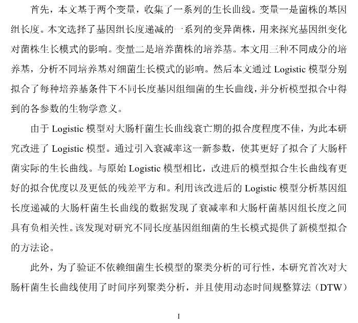 本文用三種不同成分的培養(yǎng)基,分析不同培養(yǎng)基對(duì)細(xì)菌生長(zhǎng)模式的影響。然后本文通過Logistic模型分別擬合了每種培養(yǎng)基條件下不同長(zhǎng)度基因組細(xì)菌的生長(zhǎng)曲線,并分析模型擬合中得到的各參數(shù)的生物學(xué)意義。由于Logistic模型對(duì)大腸桿菌生長(zhǎng)曲線衰亡期的擬合度程度不佳,為此本研究改進(jìn)了Logistic模型。通過引入衰減率這一新參數(shù),使其更好了擬合了大腸桿菌實(shí)際的生長(zhǎng)曲線。與原始Logistic模型相比,改進(jìn)后的模型擬合生長(zhǎng)曲線有更好的擬合優(yōu)度以及更低的殘差平方和。利用該改進(jìn)后的Logistic模型分析基因組長(zhǎng)度遞減的大腸桿菌生長(zhǎng)曲線的數(shù)據(jù)發(fā)現(xiàn)了衰減率和大腸桿菌基因組長(zhǎng)度之間具有負(fù)相關(guān)性。該發(fā)現(xiàn)對(duì)研究不同長(zhǎng)度基因組細(xì)菌的生長(zhǎng)模式提供了新模型擬合的方法論。