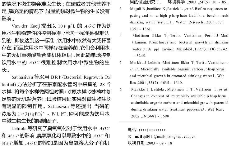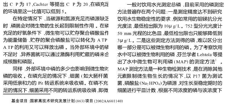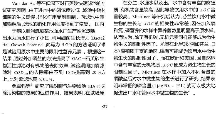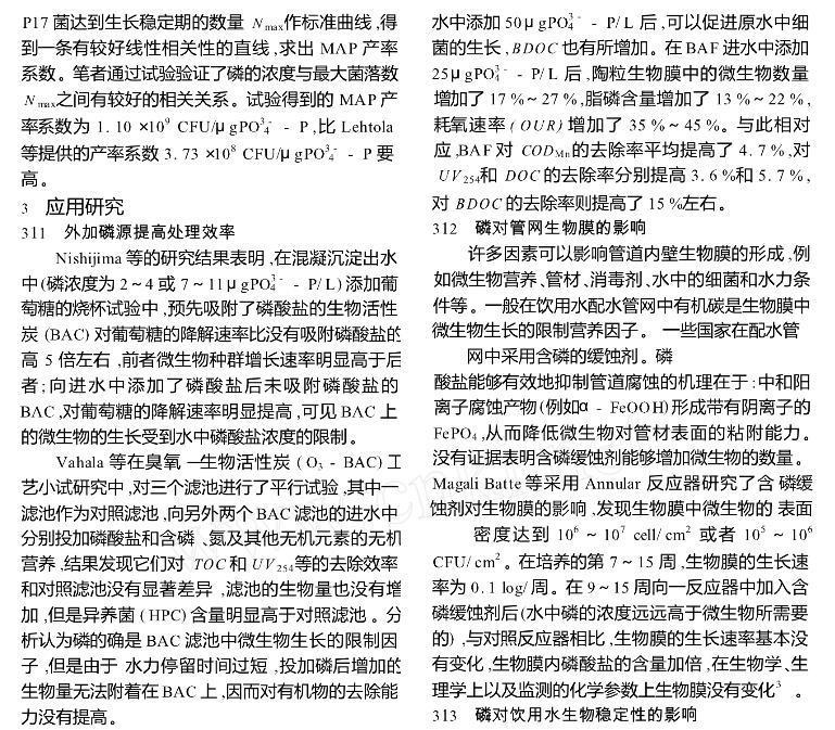 【摘要】:闡述了磷在微生物生長中的重要作用以及磷限制微生物生長的作用機(jī)理,介紹了飲用水中可以被微生物利用的磷源。著重從三個方面討論了磷對微生物生長限制作用的最新研究進(jìn)展:外加磷源提高水處理構(gòu)筑物的處理效率;磷對管網(wǎng)生物膜的影響;磷對飲用水生物穩(wěn)定性的影響。