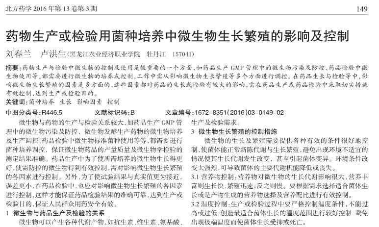 【摘要】:藥物生產(chǎn)與檢驗(yàn)中微生物的控制及使用是較重要的一個(gè)方面,如藥品生產(chǎn)GMP管理中的微生物污染及防控、藥品檢驗(yàn)中微生物使用等,都需要進(jìn)行微生物的培養(yǎng)或控制,工作中需從影響微生物生長繁殖等多個(gè)方面進(jìn)行調(diào)控。在藥品生長與檢驗(yàn)等中,影響微生物生長繁殖的因素是多方面的,這些因素都對藥品的生長或檢驗(yàn)有較大的影響,需在藥品生產(chǎn)或藥品檢驗(yàn)中采取切實(shí)措施有效控制,達(dá)到生產(chǎn)或檢驗(yàn)?zāi)康摹?