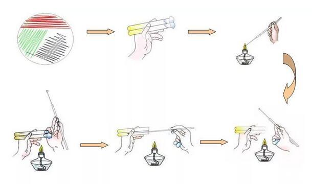 (1)接種滅菌(2)開(kāi)啟棉塞(3)管口滅菌(4)挑起菌苔(5)接種(6)塞好棉塞。