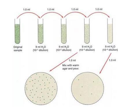 首先把微生物懸液通過(guò)一系列稀釋,取一定量的稀釋液與熔化好的保持在40-50°左右的營(yíng)養(yǎng)瓊脂培養(yǎng)基充分混合,然后把這混合液傾注到無(wú)菌的培養(yǎng)皿中,待凝固之后,把這平板倒置在恒箱中培養(yǎng)。單一細(xì)胞經(jīng)過(guò)多次增殖后形成一個(gè)菌落,取單個(gè)菌落制成懸液,重復(fù)上述步驟數(shù)次,便可得到純培養(yǎng)物。