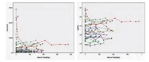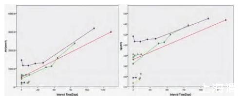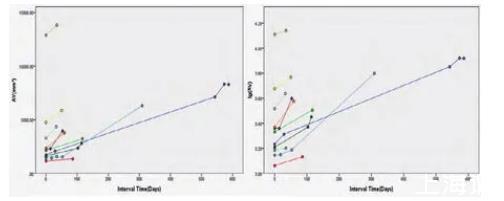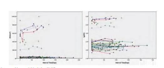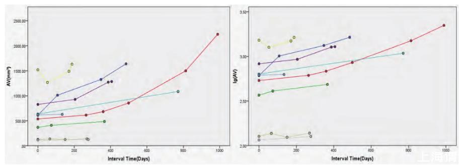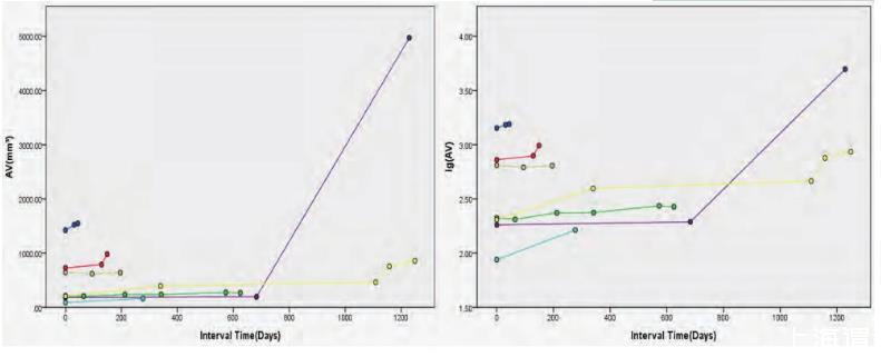 以隨訪間隔時(shí)間(天)為X軸,其中第一次檢查時(shí)間為0天;以隨訪CT檢查結(jié)節(jié)的三維體積(mm3)及體積對(duì)數(shù)(lgAV)為Y軸,繪制結(jié)節(jié)的體積生長曲線圖。圖中每一條曲線代表一例肺結(jié)節(jié)的生長情況。采用體積對(duì)數(shù)的原因在于肺癌的生長模型包括指數(shù)模型,對(duì)數(shù)轉(zhuǎn)換后更易于觀察結(jié)節(jié)的生長特性。在標(biāo)準(zhǔn)(Y軸為體積)生長曲線中,曲線的斜率提示結(jié)節(jié)體積變化的幅度,生長緩慢的結(jié)節(jié)曲線斜率較小,生長快速的結(jié)節(jié)曲線斜率較大。對(duì)于多次隨訪的結(jié)節(jié),其曲線在標(biāo)準(zhǔn)曲線中呈直線提示線性增長;在對(duì)數(shù)(Y軸為體積對(duì)數(shù))生長曲線中呈直線代表指數(shù)型生長。