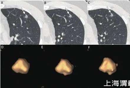 圖2男,47歲,左上葉實(shí)性結(jié)節(jié),直徑約為1.0 cm,病理為浸潤性腺癌。A、B:2013/03/12第一次CT檢查,體積為211 mm3;C、D:2013/10/10檢查,體積為235 mm3;E、F:2014/11/27檢查,體積為267 mm3。在20個(gè)月的隨訪中,結(jié)節(jié)體積無明顯增長,但術(shù)后病理診斷為腺癌。