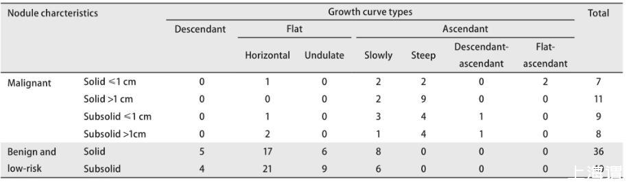應(yīng)用卡方檢驗(yàn)評(píng)估不同性質(zhì)肺結(jié)節(jié)的生長曲線類型是否存在差異。采用SPSS19.0軟件完成統(tǒng)計(jì)分析,以P<0.05認(rèn)為差異有統(tǒng)計(jì)學(xué)意義。