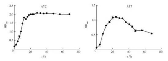 圖1菌株AY2和菌株AY7的生長曲線(常規(guī)方法)Fig.1 Growth curve of strain AY2 and AY7(Conventional method)