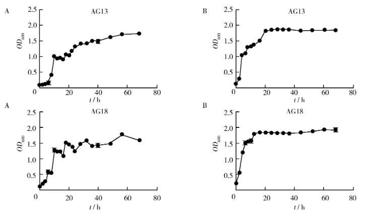 圖2菌株AG13和菌株AG18的生長曲線Fig.2 Growth curve of strain AG13 and AG18A:常規(guī)方法;B:改進(jìn)方法①A:Conventional method;B:Improvement method one