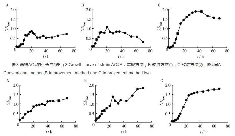 圖3菌株AG4的生長曲線Fig.3 Growth curve of strain AG4A:常規(guī)方法;B:改進(jìn)方法①;C:改進(jìn)方法②,圖4同A:Conventional method;B:Improvement method one;C:Improvement method two